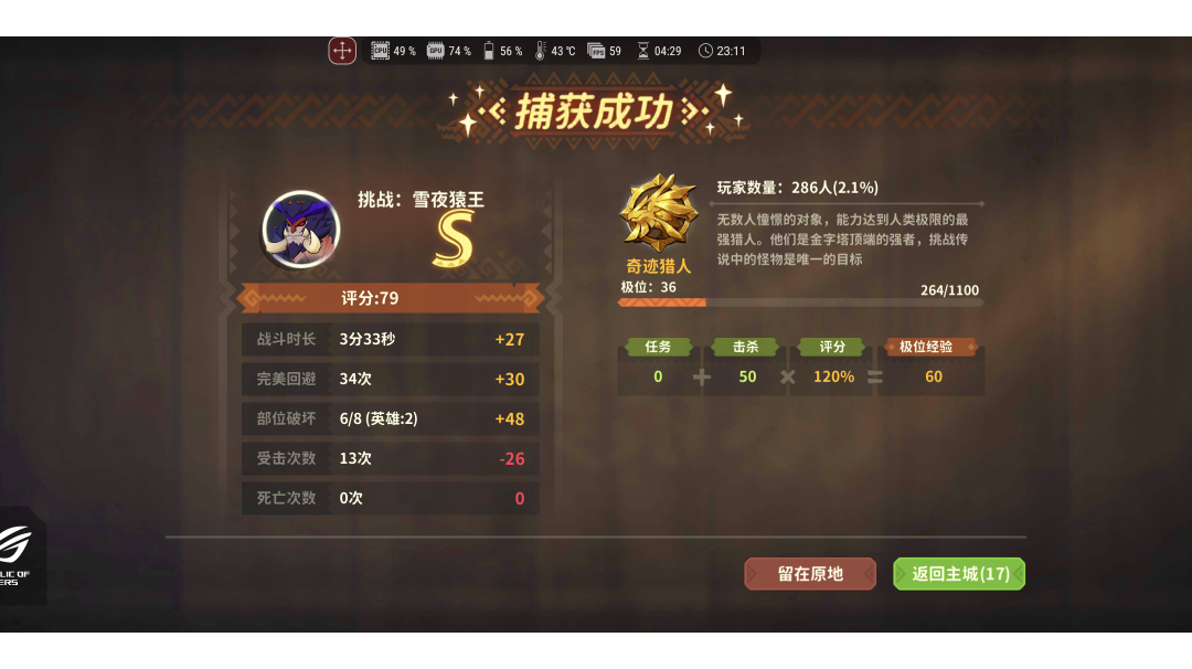 前排提示:不要过度依靠速刷视频速度代入武器强度 这个不代表回旋镖速刷翡霸龙上限,我自己回旋镖玩的极少,总场次现在20左右,熟练度较低,速刷全靠怪物配合凹出来的 总结下回旋镖速刷体验,成绩上下波动是我目前速刷过的武器里(弓/唐刀/双刀)波动最大的,一套动作较长的后摇,对每次时机把控要求更严格,整体战斗中,保持自由态观察怪物动作的时间需求更多,速刷表现自然就低于其他大部分武器,翡霸龙的表现中已经算是有较强的伤害压制了,伤害再低一个档位,比如不氪药不带英雄,速度就会大幅下降,属于典型的开荒/日常环境难度较高,速刷表现也比较差的情况,这个还和大剑不一样,大剑也属于开荒/日常环境难度较高,但伤害提升后,有大量伤害压制,速刷表现还不算差的,回旋镖的性能感觉仍需优化,不过回旋镖也有正向反馈,每次蓄力镖飞出去全中的伤害数字带来的体验很强,同时回旋镖应该也是除了满命唐刀外,异常触发速度最快的武器了 守护搭配:十色+姐弟 BUFF:睡觉+奢侈温泉+9星猫饭 药品:特效狂暴+古老秘药+特效活力+浆果+仙人球+野生菇 装备: 武器:翡霸回旋镖(攻击/攻击/岩属性/爆伤) 头:翡霸(无伤/爆伤/岩元素) 衣:翡霸(无伤/无伤/岩元素) 手:翡霸(攻击/伤害加深/岩元素) 肩:翡霸(攻击/伤害加深/无伤) 项链/手环/腰包:11星(攻击/攻击/爆伤) 护符:12星(岩元素) 洗练非极限,攻击洗练均值90,岩元素洗练均值60,黄色/蓝色孔随缘洗练