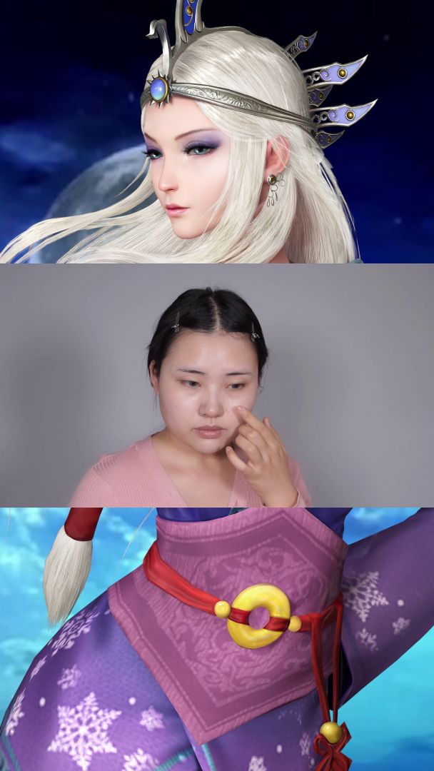 @秦时明月世界手游 看我百变秦时古风妆!端木蓉整体上给人清新淡雅的感觉🍃在妆容上也属于偏淡的一类,从原动画中可以看出端木蓉娇眉露目,眉宇苍凉。🌸因为本人的皮肤不属于冷白皮,所以底妆和粉底液用的比较重,就是为了打造一种轻薄无暇的透明质感吧!🌸我们今天妆容的亮点在眼部。美瞳选取的是日常瞳,外圈是褐色,内圈是黑色。在眼部妆容上,选取的是用深棕色铺满褶皱,眼影部分选用的是淡粉色多次晕染眼尾部分,看上去