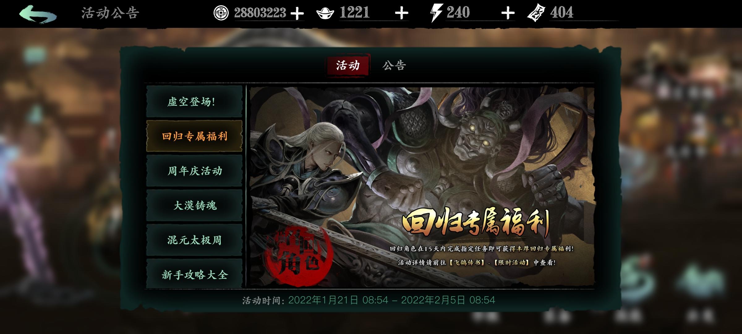 请问各位大佬,我退游半年多,除了虚空外其他5个角色都是65级,昨天登录选择左殇,弹框显示有回归活动(第三张截图),但是进游戏之后找遍所有地方都找不到回归任务面板,请问这个回归任务在哪里找?