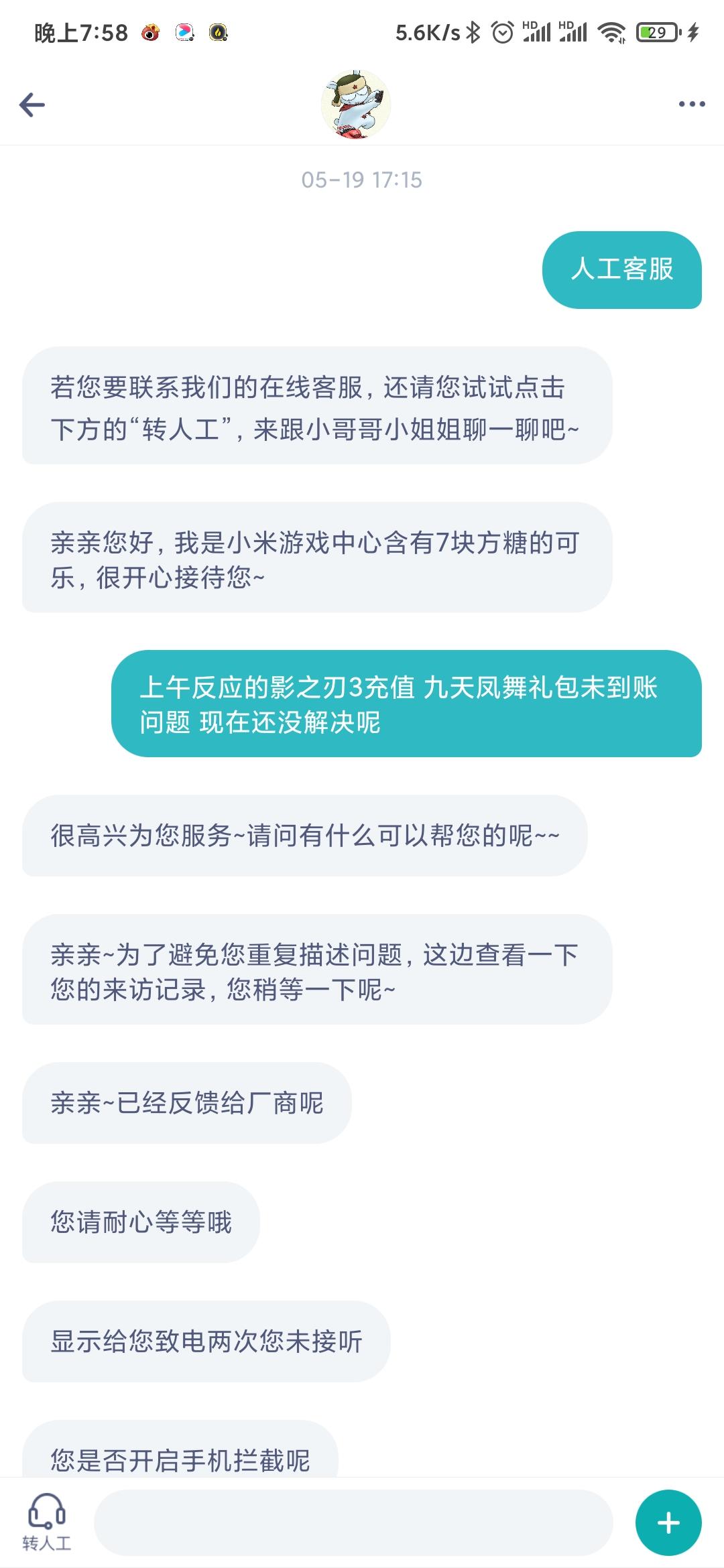 凤舞九天礼包充值未到账!小米渠道的,钱是扣了,不给东西。游戏内反馈,客服说找小米客服,找了小米客服确认问题,说是东西未到账是游戏数据问题,没办法已经反馈给厂家,来回就踢球呗?现在厂家也不给解决,不给回复。真的让玩家寒心了!兄弟们,这就是小作坊!😒