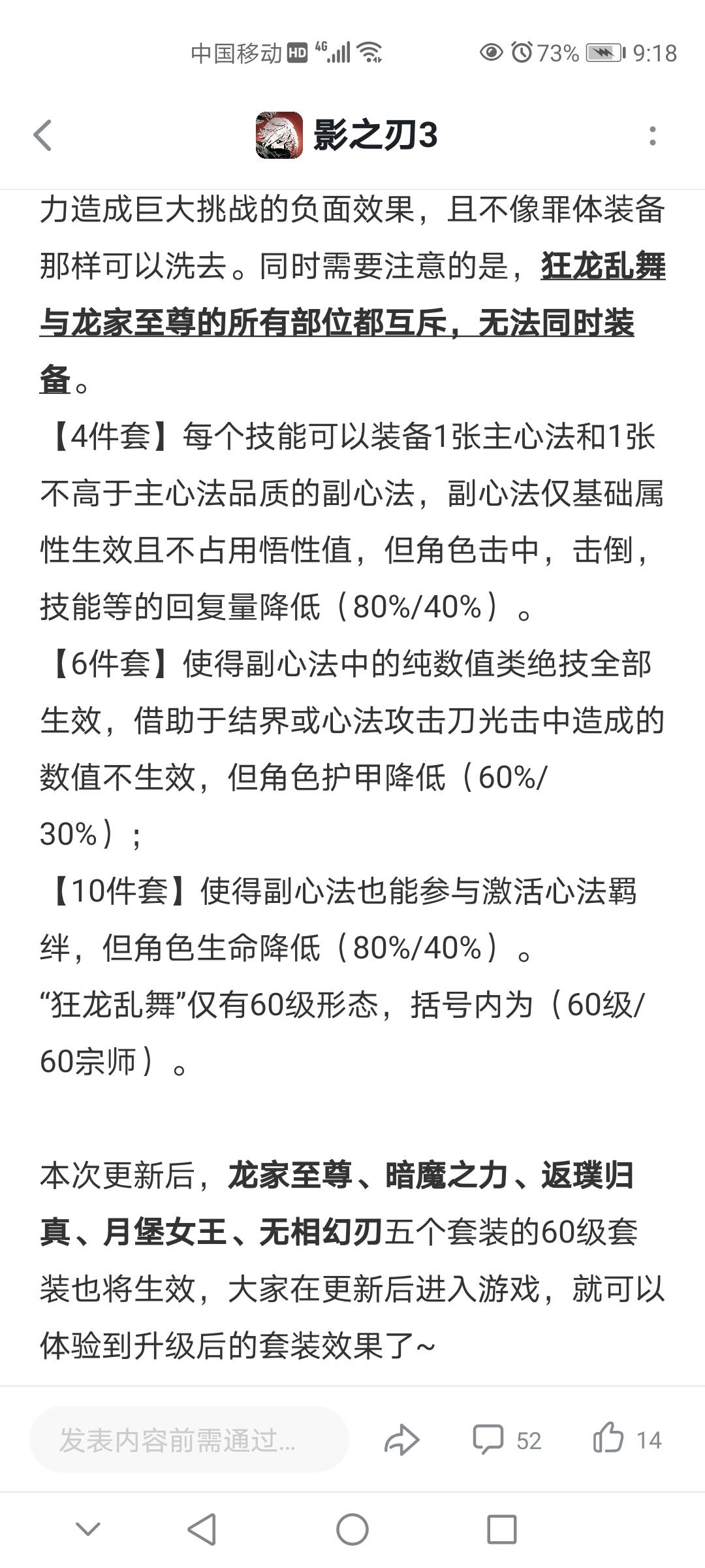 这套新装备的出现让心法的搭配有了更多的可能性,但是装备的局限性太大了另外6件套属性,在大佬的多张极品心法前提下数值会崩的很厉害,多张魔堡多张银铃这种操作会让某些数值超模,目前新的橙贴只是表明了60级的龙家套装,到底限不限制40级的目前未知,如果可以的话,那数值很更加离谱。这是一个方面。另外新装备的存在6件套效果对于一般玩家收益又不会很高,但是如果追求10件套效果即使在五胜和魔堡3级羁绊的加持下,