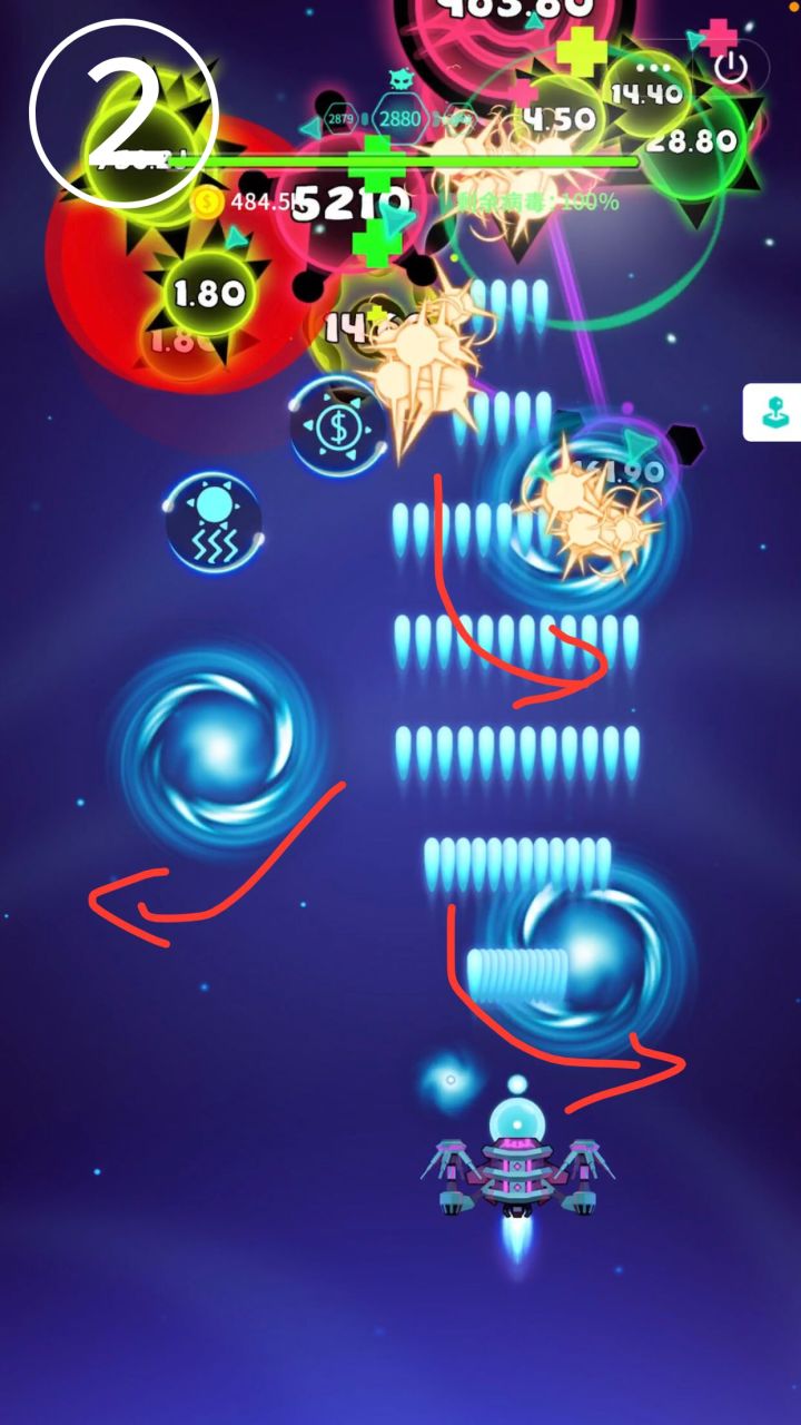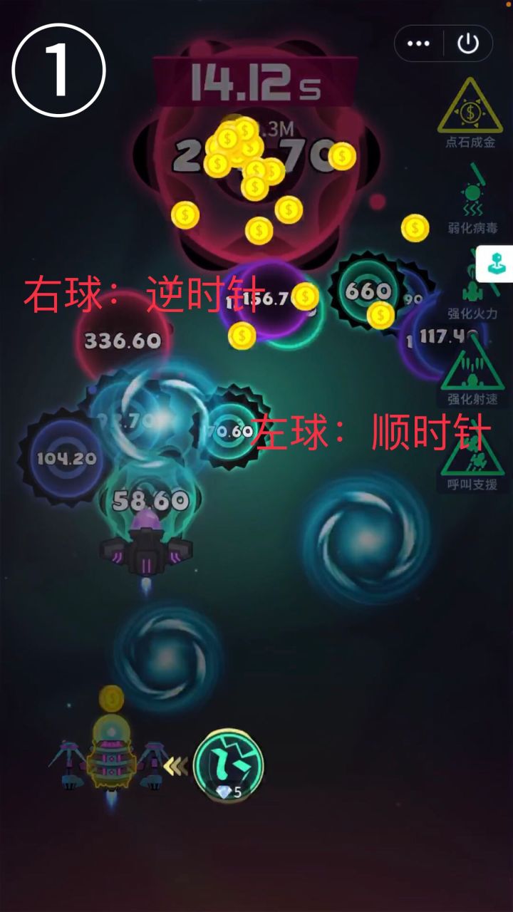 我的射速和火力都是80级,电锯拉满 开局卡暂停尽快吃到超级武器和巨化细胞,这两个是必要的,其次是点石成金,刷钱用 吃到buff后就在视频这个位置挂机就行了,期间刷出来的buff先别吃,等电锯准备进入冷却,或者超武和巨化buff没了再去吃,以此循环 因为射速和火力卡级,越到后面关卡里的细胞越多,所以上述的两个必要buff是很容易出的,除非真的非,那当我没说 然后这个位置可以挂机,也可以用手指按住加速(但是可能很卡,点石成金那个满屏幕金币太夸张了)