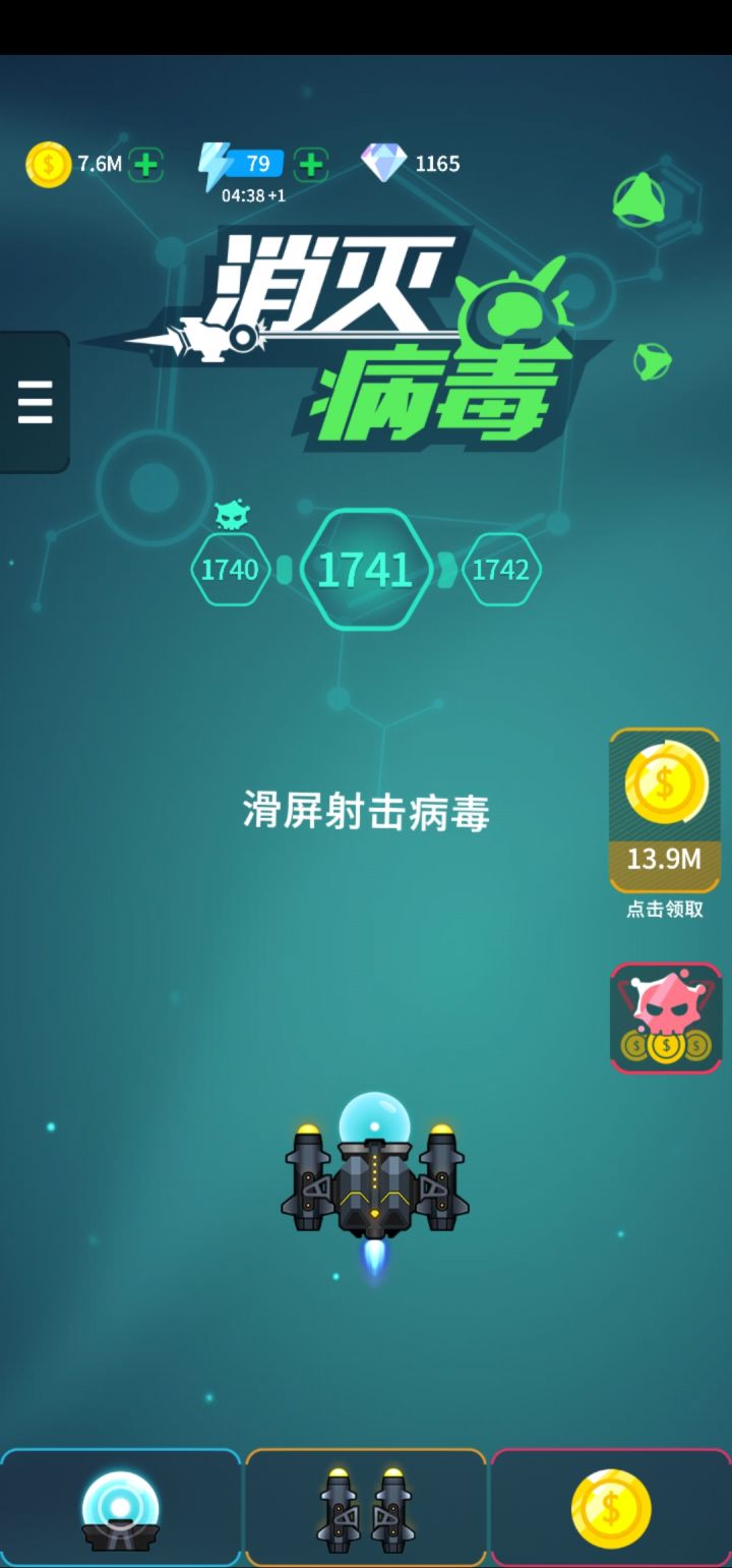 自从接触了消灭病毒后,就无法自拔,每天都要把体力玩没。还无数次的重置手机重新开始实验刷金币的卡火力套路,为了1射速1火力能坚持半个月。。。真的是爱上了这款游戏,真的太好玩了。这两天突然发现了一款新奇的游戏,叫消灭球球,反正市面上的这类型游戏都是抄袭咱们游戏的,大家都知道。但是我发现了这个游戏的一些特色,如子弹根据关卡可以花钻石解锁新形象升级提高火力或者其他功能,飞机主体加了双翼附带各种技能,