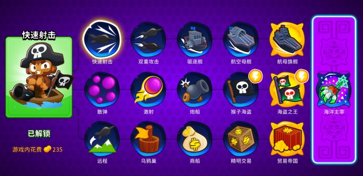 第一支线:100攻速200双发射手300攻速400拥有战斗机,召唤3个小飞机作战500拥有航空母舰,增加3个小飞机的伤害航空母舰上能放置两个小陆地塔,攻速增加18%,拥有真实伤害第二支线:010伤害020破铅030伤害040秒杀BFB飞艇050秒杀ZOMG飞艇第三支线:001射程002检测迷彩003每回合200$004每回合500$,售价增加10%005每回合