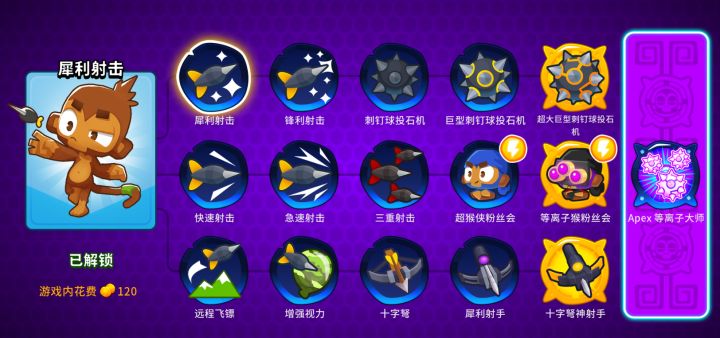 第一支线:100穿透200穿透300拥有弹射能力400拥有真实伤害500拥有分裂能力第二支线:010攻速020攻速030三线射手040最多变身10个000超猴050最多变身20个200超猴,紫气球无视200超猴第三支线:001射程002射程,破迷彩003射程,伤害,穿透004每10次攻击会暴击005每5次攻击会暴击,拥有真实伤害通常使用025来获取高额的暴击DP