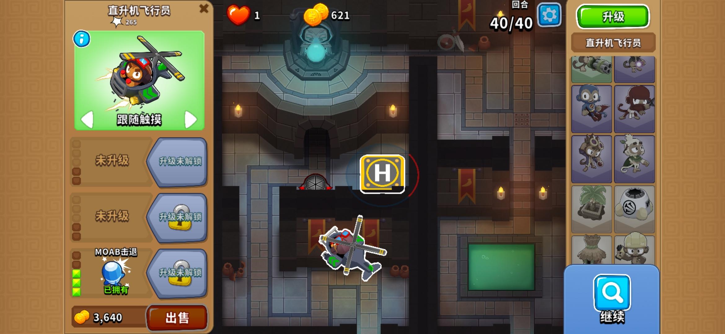 将040炮塔放远点(以防将MOAB打破),并用003胶水猴减速MOAB,等040炮塔技能转好,直接一击秒杀。#气球塔防6
