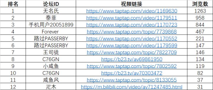 经过一个月的踊跃参与,恭喜以下玩家获得本次视频征集活动的奖励。(活动详情,)【获奖名单】请以下获奖玩家:· 无名氏· 泰菲· 手机用户20051899· Forever· 路过PASSERBY· 王司徒· C76GN· 小咸鱼· 咸鱼风· 疋木加入我们的官方Q群:736250242,并联系客服小姐姐,选取您的心意礼品,经核实之后,我们会发放奖品。礼品发放须知1、 本次
