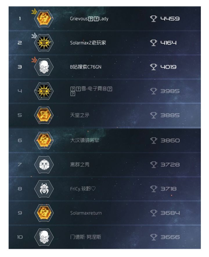 【获奖名单】☆ 1-3名:Grievous LadySolarmax2老玩家B站搜索C76GN(已发放)请以上3名玩家在官方QQ群联系客服小姐姐告知联系方式哟☆ 4-10名:雪-电子霓音天堂之矛大汉骠骑将军离群之秀FriCy.筱黔❤Solarmaxreturn门德斯·努涅斯※ 请以上10名玩家将你们的账号ID在本帖回复或者发给官方QQ群的客服小姐姐!!!新赛季开始了,