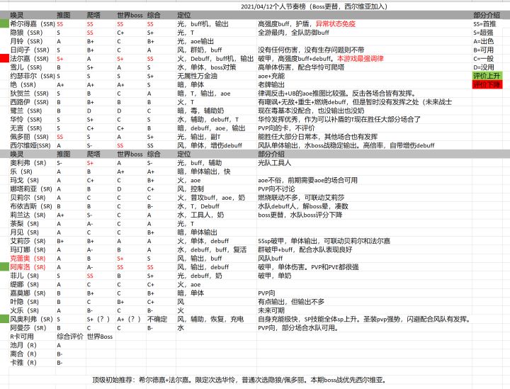 由于新Boss的出现,水队Boss评分下降了。风队评分上升。新ssr西尔维亚值得抽取。--------------------------------------------------------------------------------------------------西尔维亚是风队单体伤害最好的选择。法尔嘉本期可以被代替。希尔德嘉异常状态免疫非常关键。-----------