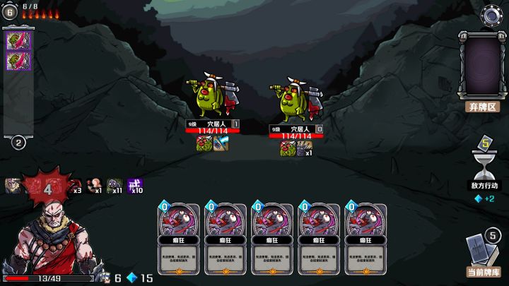只要我的手速够快,新手教程就引导不了我。在刚刚进入教程时把劈砍扔掉,然后在教程没有反应过来时点击下一回合,让你扔旋风斩时只点一下不扔,就会无法行动