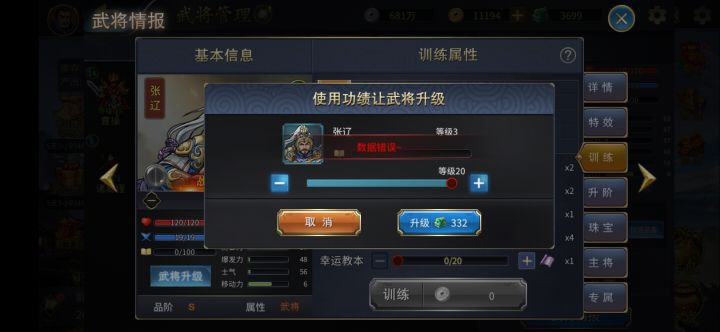 用功绩给张辽升级 提示数据错误用张辽去战斗 过关就提示数据错误 要求重启服务器:割发代首账号:血Se践踏