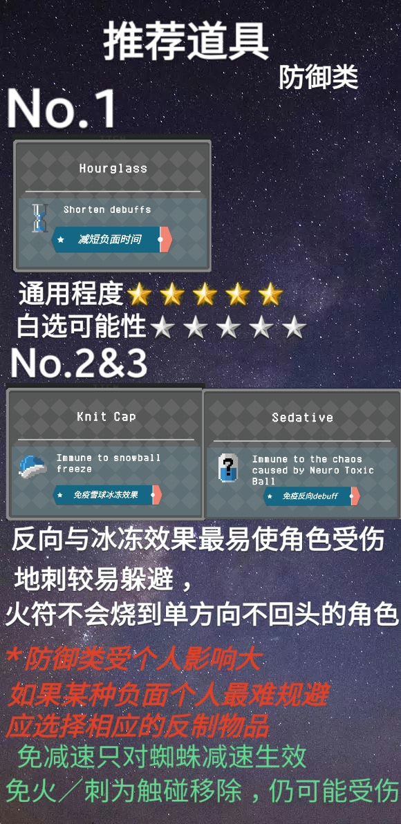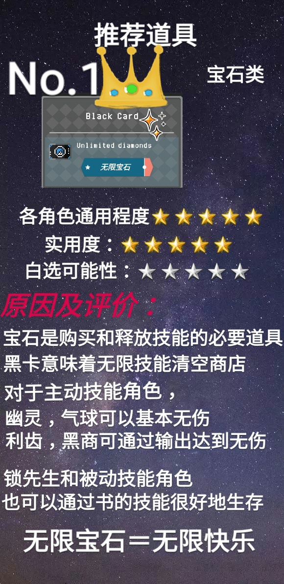 这一类物品看个人喜好和操作水平,如果你的操作水平足够,也可以一个都不要,如果是手残党,这一类物品优先级应高于除血量物品和黑卡外的一切物品。