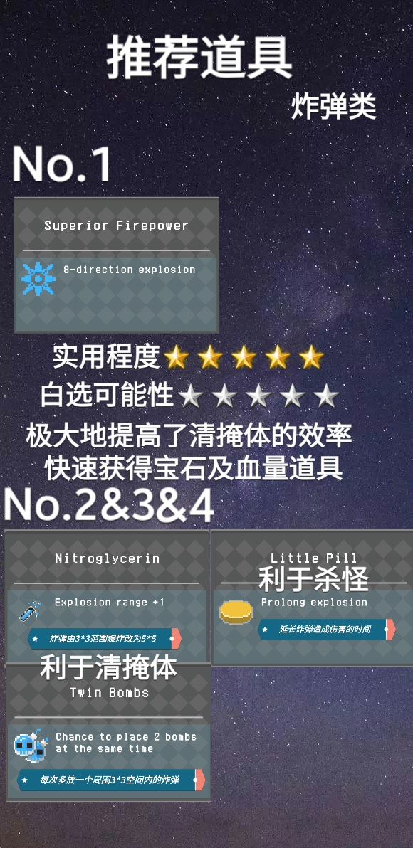 八向爆炸可以提升炸箱子数4个,相比扩大范围适用情况的范围较广,故首推八向爆炸。双炸弹看似快乐,实际并不是必定双炸弹,而且爆炸范围重合较大,双炸弹的位置也很看脸,故也不是首推。以上物品商店价格均为10宝石,由于炸弹为常用及最稳定获得的物品,一般看到且宝石足够就买,毕竟大量宝石血量都要靠炸掩体获得。