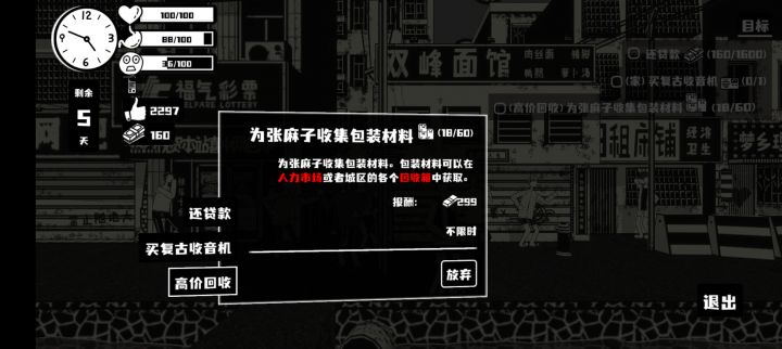 过第一阶段了,本来挣了1733块钱后来花了点钱吃饭,等时间睡觉直接过。1.任务:满状态优先做资深分拣任务(我能达到250收益大家应该都差不多),看广告,从罗什么什么的一个人那里拿车钥匙解锁送外卖,快乐不够的时候用送外卖补,外卖是随时随地的,一天一次,所以可以18点前搞掉人力市场的任务,晚上吃完饭去做快递。如果快乐几乎为0就去蒸桑拿,蒸桑拿的时候要顺路完成在澡堂里的任务要不然就算快乐满了还是亏,