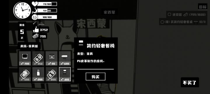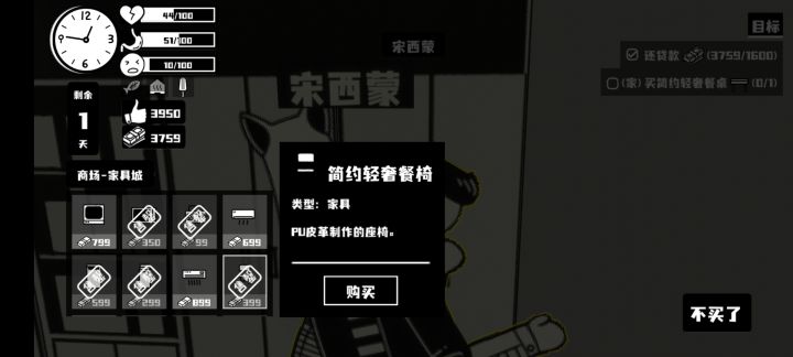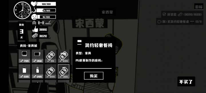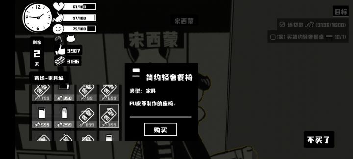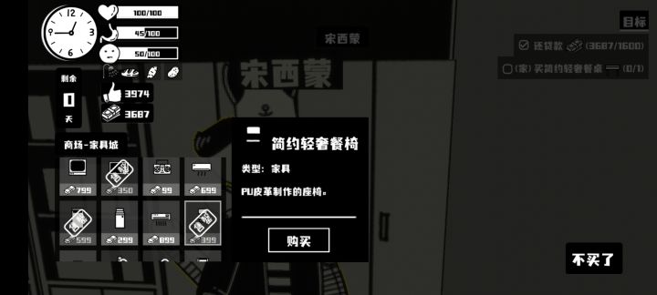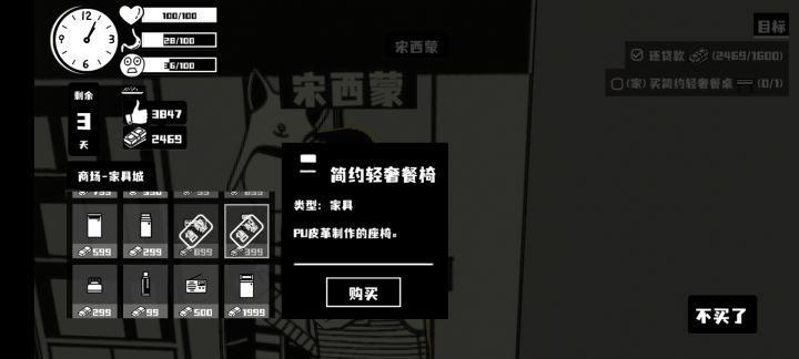 任务中要买“简约轻奢餐桌”,商场二楼西蒙那里所有在卖和已卖完的所有家具选项中,没有这个家具