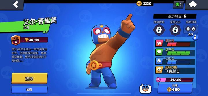 艾尔·普里莫(俗称“拳王”、“胖子”)是《荒野乱斗》中的稀有品质英雄,在新手阶段很容易解锁,而且拥有全游戏第二高的生命值,但射程却是全游戏最短的。极高的生命值赋予了拳王很好的生存能力,但最短的射程又很大程度上限制了拳王的伤害输出。今天,我们将全面详细地讲解下拳王的使用方式和实战技巧,教你如何玩转这个擅长近战的坦克英雄。一、基础信息满级拳王的生命值为8400点,在全游戏中排名第二,仅次于弗兰肯