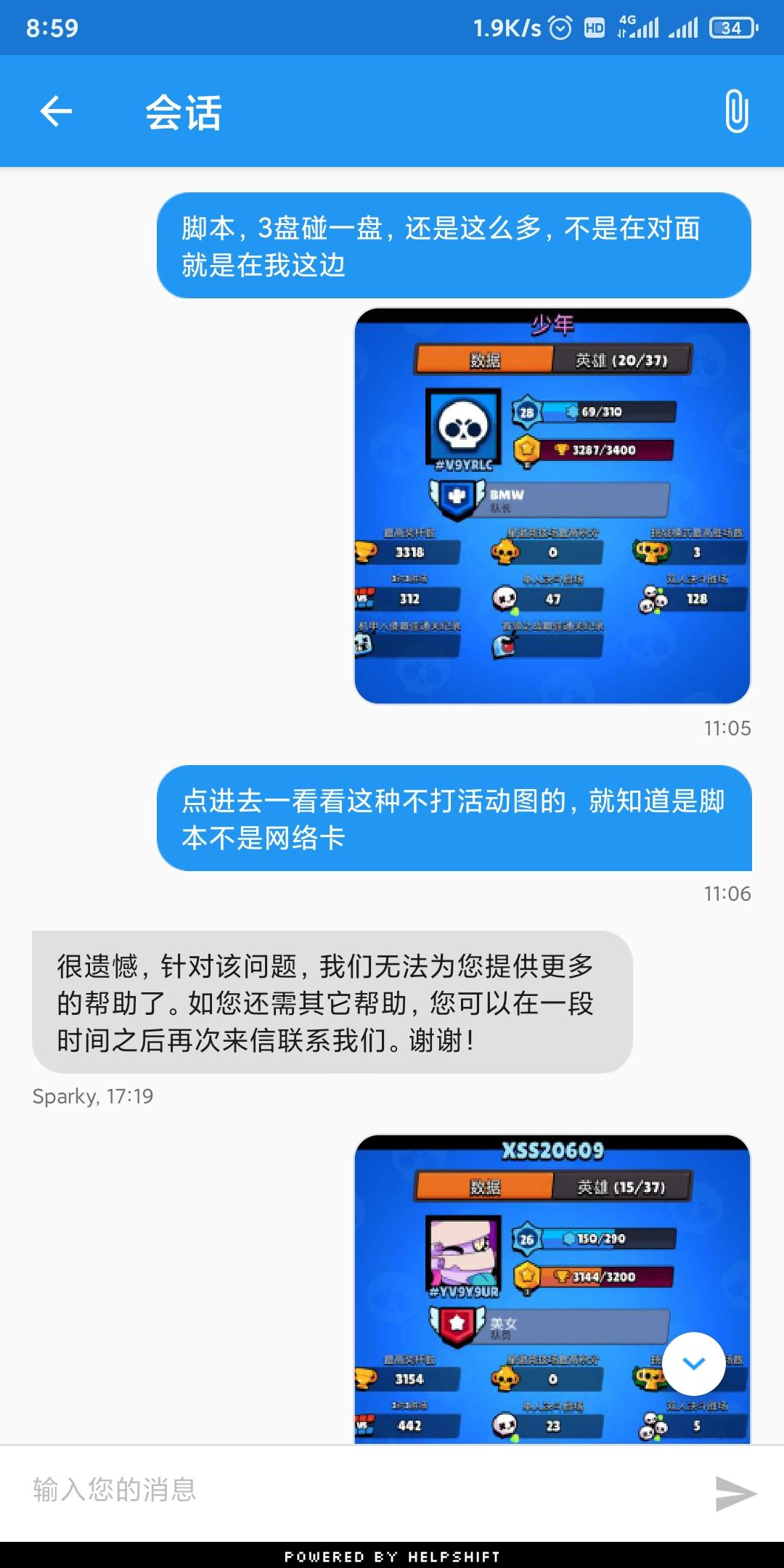 辗转了好几个平台,腾讯,游族,各种打客服电话,他们都说只是代理,不具备后台管理功能,最终还是找回到开发商这里,我是一个游戏主播,从荒野乱斗内测就开始玩了,我的国服ID#88R9JVUC 我的账号从今天早上登录就被提示封禁31天,瞬间感觉懵逼,我主要做国服大炮教学视频,直播时候有时长任务,平时都跟朋友兔斯基双排,我用的闪电模拟器,能不能是模拟器得原因,有时候遇到挂机的我们也会停止不玩,谁也没必要给挂