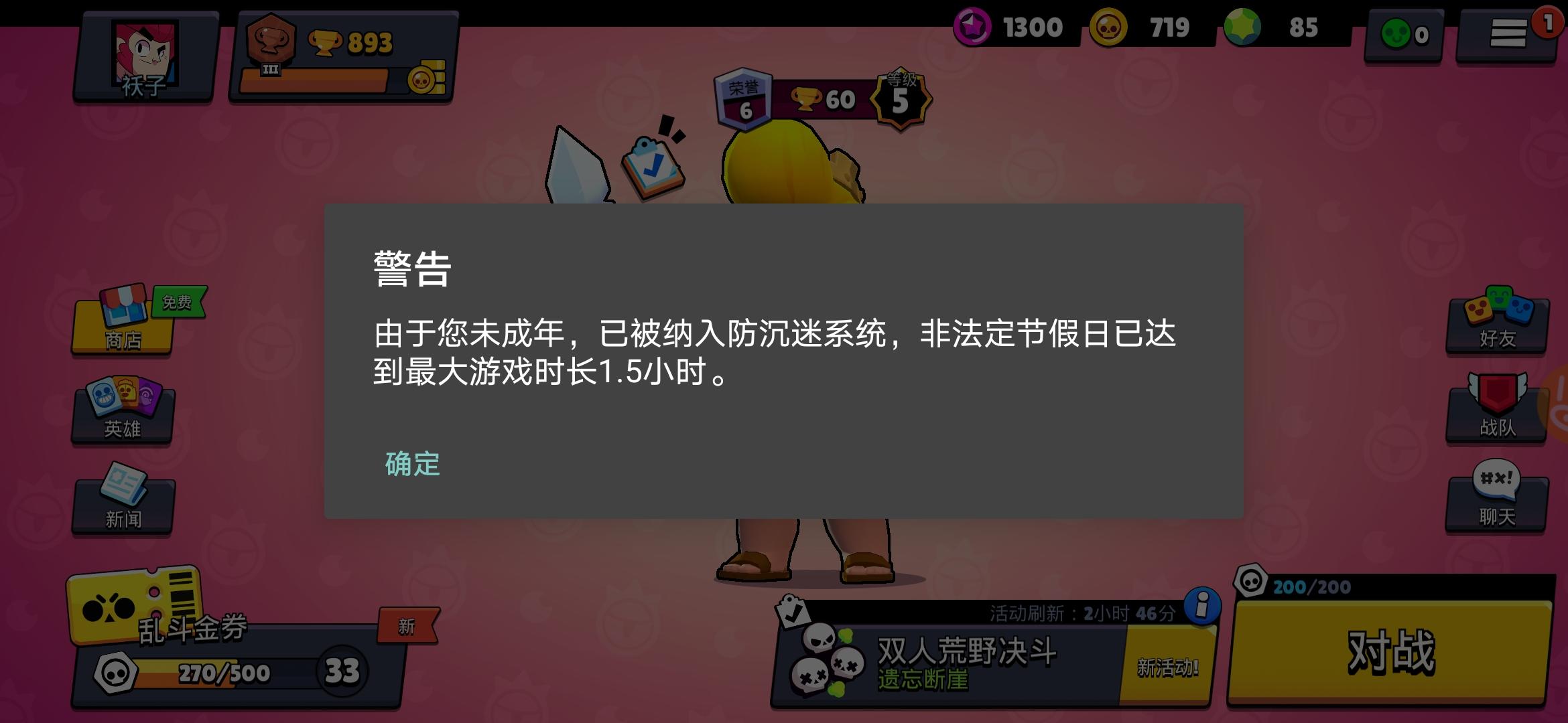 前天打满了90分钟。昨天一上线就告诉我限时了,然后今天一上线也是这样,直接不让我玩了......找客服也没回复