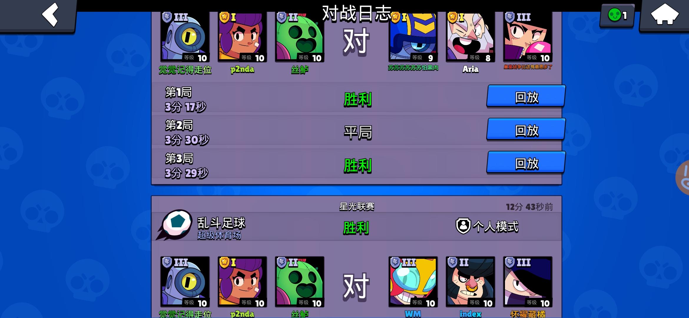 先输了一把,结果后面把把平局,每次都是双方都进一球然后打加时互相防守,我们没那么多输出,我还被克制了,但我们防守打得特别顽强,最起码防了4个大脚,球赛踢得很精彩,大家心态都有点把持不住,毕竟2胜的比赛足足踢了6场,最后一局大家防守都很好,都没进球,加时赛我们防了一个大脚,反手杀了对面,靠一个大脚绝杀了对面!可惜不能回放,不然还真挺有意思的
