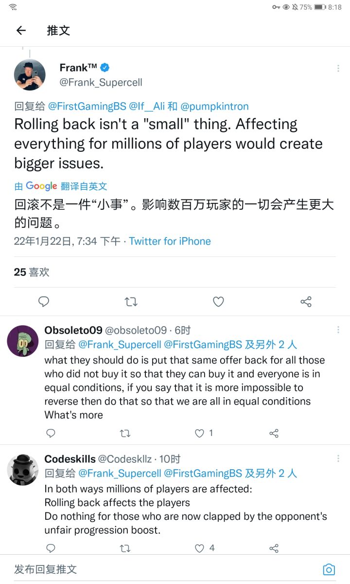 18¥140个超级宝箱真的是吓到我了 那天我其实也看到了,但是介于没玩自己的号,再加上没钱就没看1.关于回档一事Frank持否定态度原因就是回档会针对全体玩家进行 也就是说在这段期间里有人有幸没买礼包开出了传奇的话也会被回档 想想也知道其实回档也不是什么公平的事至于补偿嘛…目前看来补偿就是一个道歉 毕竟补偿点多的话那些买完礼包的也能领,就会发生类似于某塔的无语事件。至于会不会干脆把那个礼包