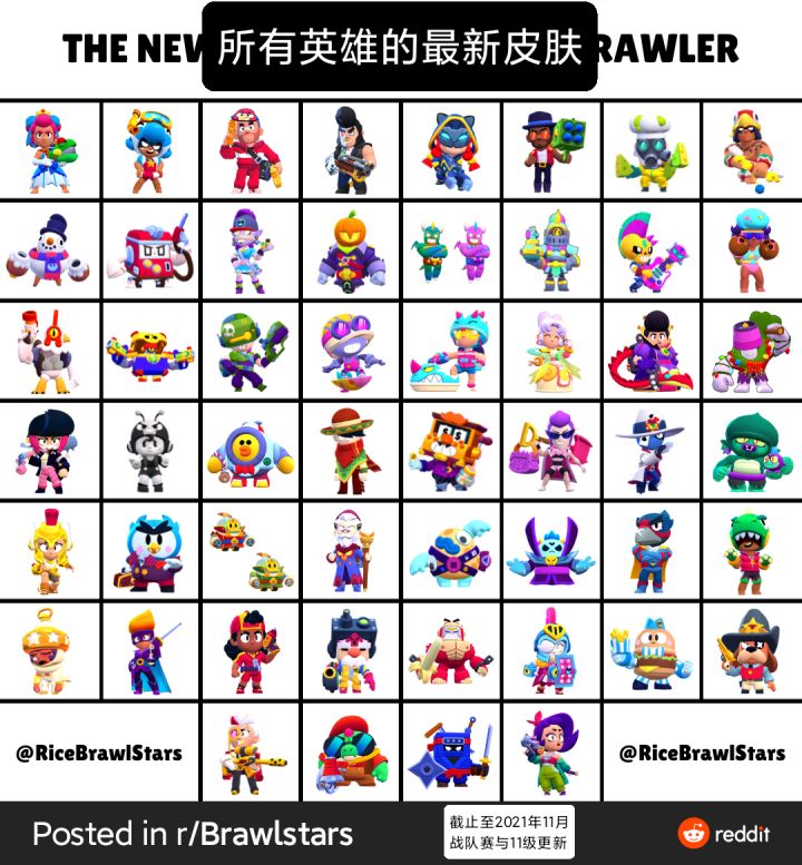 所有英雄的最新皮肤截止至2021年11月 战队赛与11级更新来自Reddit论坛网友@RicefromBrawlStars