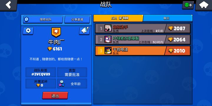 《荒野乱斗》【国服】交流互助开黑约战群。小型活动:群内定期举行小型比赛群内内战紧张刺激。大佬众多:群内万杯大佬众多分享上杯经验。团结友爱:入群后请文明礼貌,群友间互相支持。