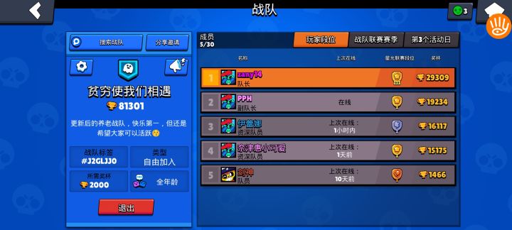 战队没啥人,想找点朋友来玩(其实就是为了战队赛)。目前没裁员机制,没有杯数要求,没有友谊赛活动。就是想把战队盘活一点吧,其他的日后会考虑。比较养老,没有任何歧视链,希望大家为了自己快乐游戏,多些微笑,少些红拇指😉