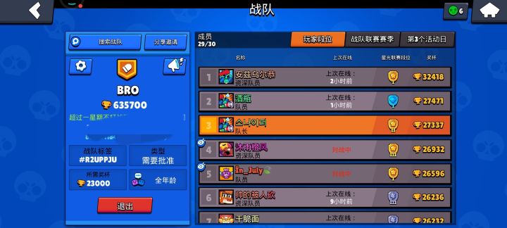 BRO战队,招活跃玩家 招聘荒野乱斗活跃玩家,主要是为了打战队赛,拿战队赛奖励。这周战队赛定级传奇一,组建队伍的3个人是开服就玩的玩家,都是全球挑战赛15胜,实力在线。 对成员的要求,23000杯以上,战队赛打满就可以了,欢迎各位玩家踊跃加入这个兄弟盟(BRO)家庭~ 战队编号:#R2UPPJU