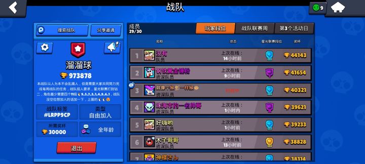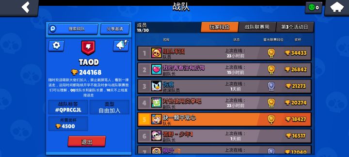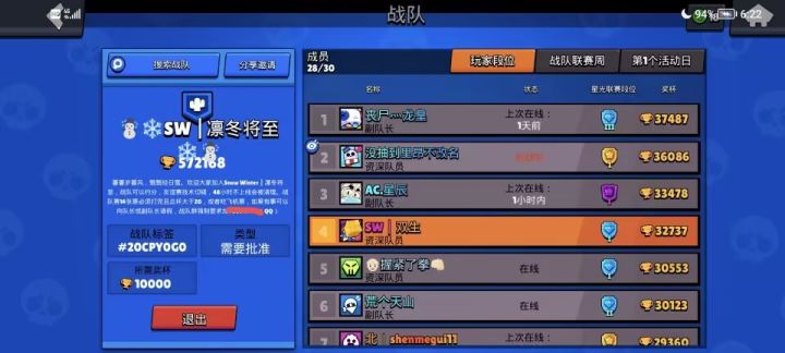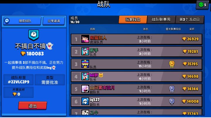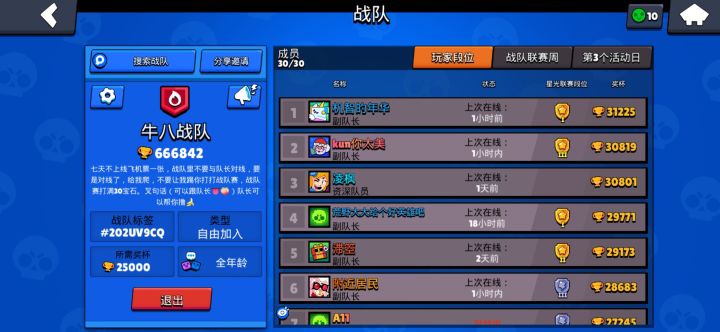 我们7个人左右,均杯3w,我5w,之前是战队队长,家族混子太多也没时间招新,奖励打不满,很糟心有活跃战队需要清人的联系