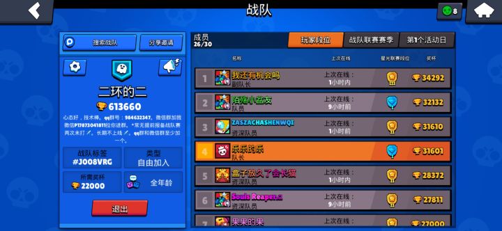 #荒野乱斗#给自己战队打个广告目前只有四个人的小战队,队内氛围极佳来了就是元老,战队赛目前还能稳定冲分,希望找到想要一同发展战队的小伙伴呀😊(真心的真心的真心的想在现在这个环境里营造一个欢乐的栖身地,谢谢各位来捧场)