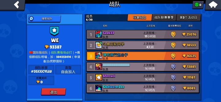 【荒野乱斗-国际服】新战队招人(2021年12月成立)【战队名称】:WE【联系方式】:搜战队标签#2GCGCYLLU【入队要求】:杯数不限,打满战队赛即可,我帮队长发发广告,目前战队100%活跃,氛围很好【图片】
