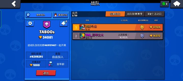 战队招人了!战队招人了!!TABOOs战队标签:#R2VR2PJ入队没别的要求,可以保持日常活跃就行。建立这个战队就是为了方便和游戏好友开黑,平时做任务也更方便。欢迎萌新和大佬加入^_^【图片】