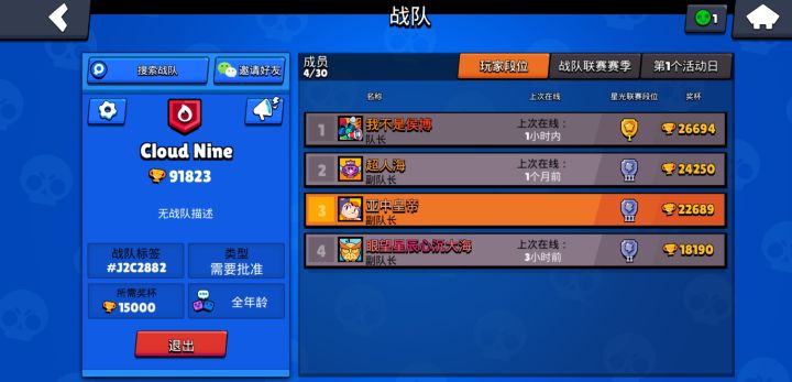 【战队名称】:Cloud Nine【联系方式】:直接搜索战队名称【入队要求】:15000以上 我们会把战队改为自由加入的【战队简介】:佛系战队,团结友爱,不肝不氪,四张票子打满就行了【补充】:12胜及以上玩家优先 33玩家优先 漂亮姑娘优先 其实没有12胜以上也不要紧 品德好就行了【战队图片】