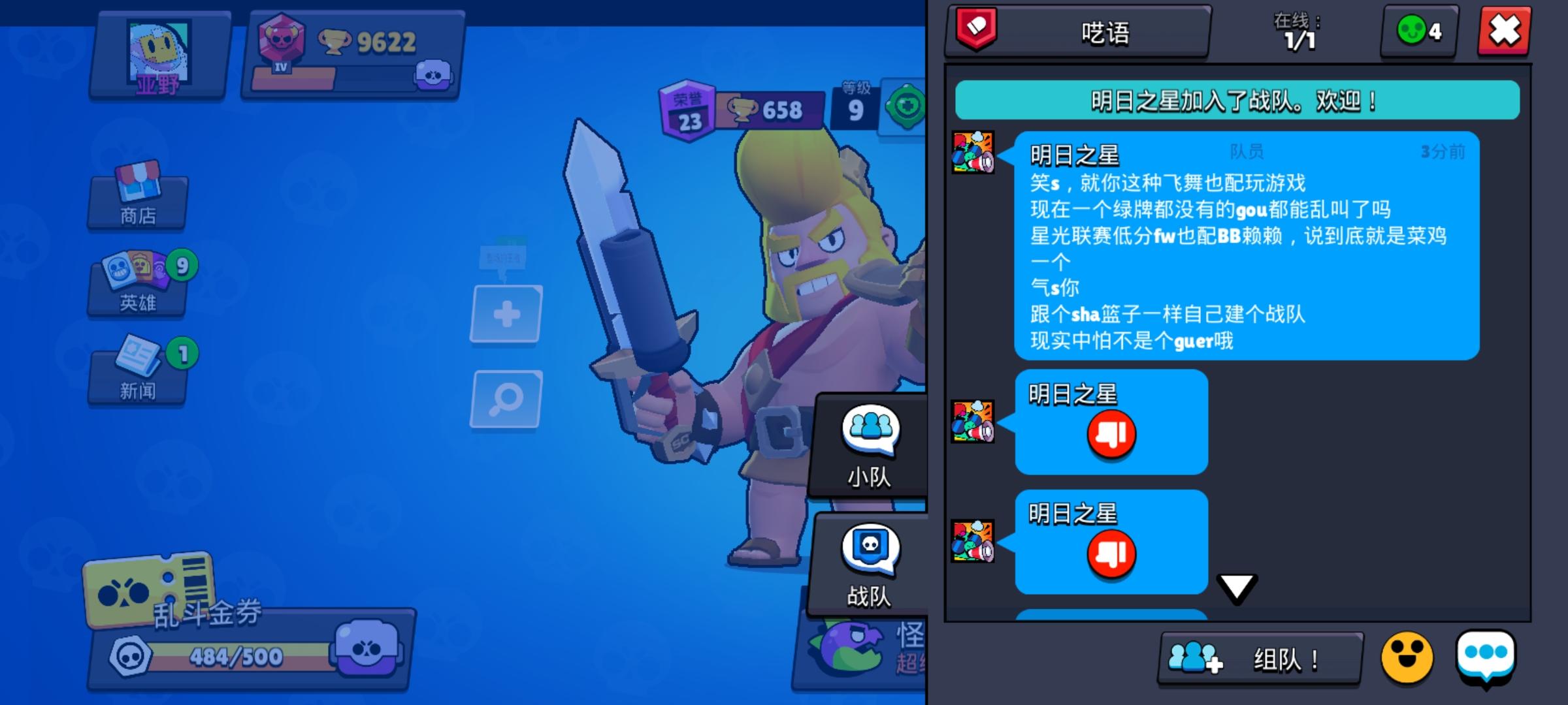 今天发生了一件很难受的事情 导致我想退坑了,中午的时候我有一个比我高4000杯的好友,提出来要带我然后还邀请我加了他的战队 ,我跟他玩了二十几把之后 基本上是输多赢少他一个杯都没加,他有点生气的责怪了我一番然后就退了,我刚开始有点心虚 然后越想越不对头,不是他邀请我的吗,为什么还骂我会不会玩,搞得好像是我特意请他一样 ,于是我就把他的好友和战队都删了,然后自己随便建了一个队,结果打怪兽大暴走的时候碰到了一个缺德的队友 ,叫明日之星,用雪莉疯狂拆墙,还一边给我发倒拇指,我还觉得挺有趣的 跟她一起好几把,可他每把都拆墙。之后他退了 我去战队那里看了看 ,发现了很懵逼的一幕,我用我有限的脑容量想了半天,才把这两件事关联起来,怪不得那家伙用雪莉啊,因为我跟之前那个好友最后一把也是用雪莉的,输了之后 他还问我会不会玩雪莉.....唉 真他妈难受,我一个大部分情况下都一个人打,偶尔陪朋友打的人 他妈的还要被骂,真他妈想退坑了