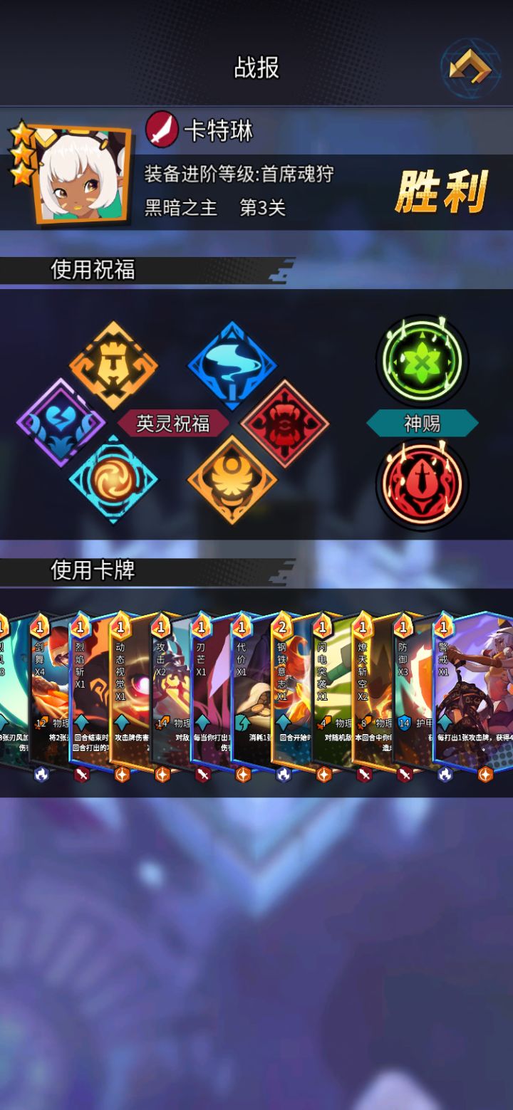 今天分享一下自己玩了三天对卡组的一些见解和分享希望对又需求的新手玩家有些小帮助!卡特琳卡组分享 因为星的级别代表带卡的要求,这里我的卡特琳是四星的卡组一: 这卡组我把它叫“小李飞刀”,主要风刃输出打连击,在冒险模式和战役我特别喜欢,能快速秒一个怪,特别是配合“血沸”这张卡主要输出“剑舞”“烈风”打出连击“燎天斩空”最后大补刀卡组二: 这卡组我把它叫“护甲风刃”,钢铁意志开启护甲保