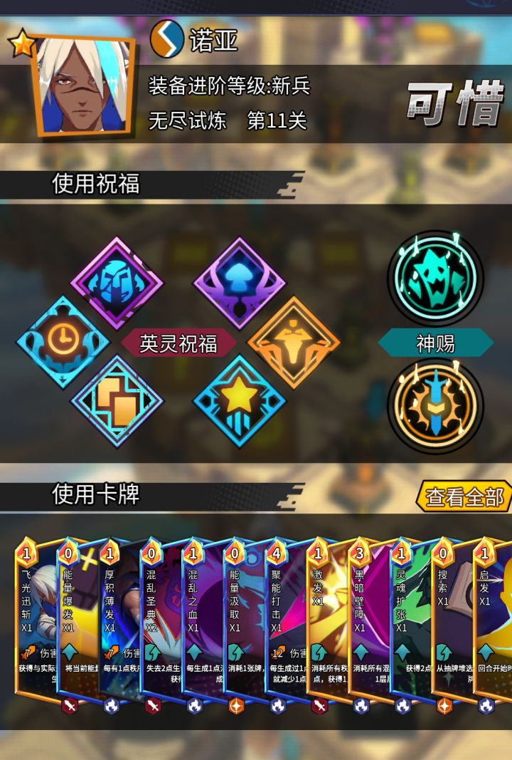诺亚有多强,一张图基本可以明白了一星,新兵11关。无尽总共是12关。练度高点配重高点,那就更轻松了。这还是我运气差了点,还有玩的比较生疏的缘故,才到11关 如果技术水平够,一星诺亚即可通关12关了吧。其他角色做得到吗?反正我打到11层的感想就是:其他角色全五星,卡牌全五星,我觉得也打不过,或者说,很难打过,的难度。简单介绍套路核心卡 黑洞:情况场上所有敌人的力量,推荐三张 保障自己起手就得