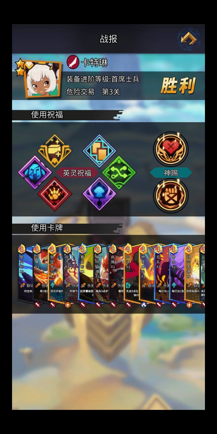 卡特琳牛逼核心就是堆护甲堆力量神赐必带御守卡牌必带双警戒双无尽怒火(你要是有条件也可以三警戒四警戒)警戒优先 强化然后是无尽怒火不要防御牌(除了坚不可摧),坚不可摧可以完美过渡前期。攻击牌主带剑舞,怒火。卡组一定要精简(不然很卡手的),这局我到最后就只有11张牌,警戒无尽怒火用掉后只有7张,其中2张坚不可摧随时可以抽到,所以完全不担心中期被秒。打法:第一个回合打状态(有警戒用警戒有