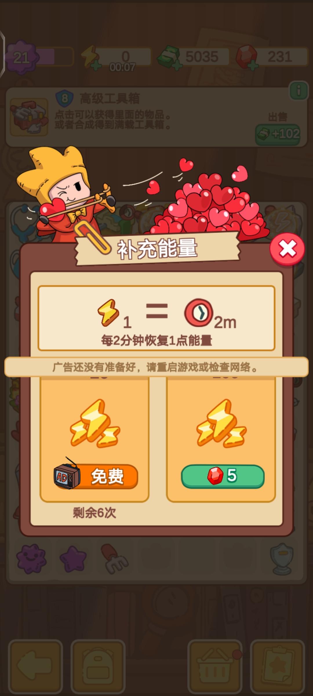 这到底是合成游戏还是什么?工具箱出来的都是铲子,红手套合成了3天都不出!充能时间太长了!