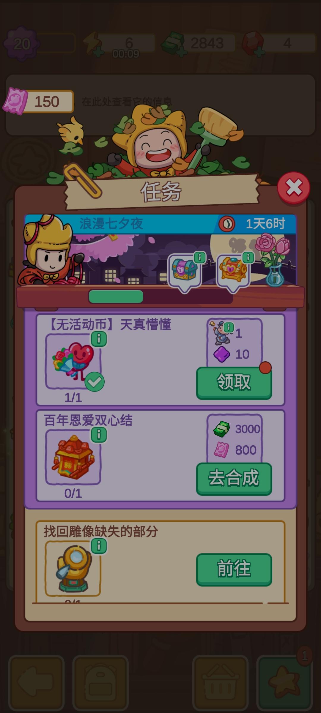 之前鹊桥的概率改了,这两天又调回去了吧,我15个,两个牛郎两个纺织剩下全是衣服,就铁了心不想让我完成?还剩最后两天不到,我要是完不成就卸载吧,一个肝完不成只能靠氪的游戏没意义,你最好凭着良心弄,之前那些意见白收集😊