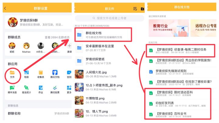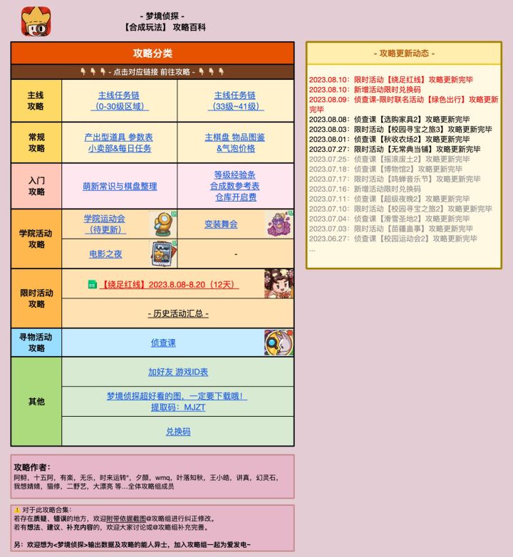 🧡梦境侦探 合成玩法 攻略百科🧡攻略指路如下~🌟攻略来源🌟【梦境侦探攻略组】(一个隐藏在官方群里的民间组织)🌟攻略地址🌟梦境侦探 各官方企鹅群的【群在线文档】里。(路径见p2)群在线文档包含⬇️:1、【梦境侦探】百科全书: 所有合成玩法的常规攻略,以及其他副攻略的链接指引。p3: 攻略首页p4: 主棋盘道具全攻略截图p5: 主线任务链攻略局部截图p6: 物品全图鉴及气