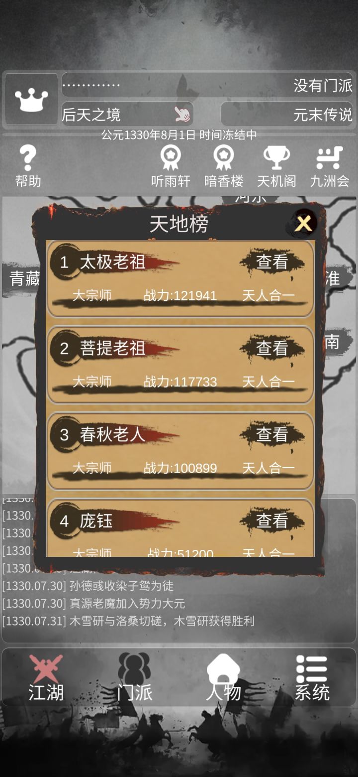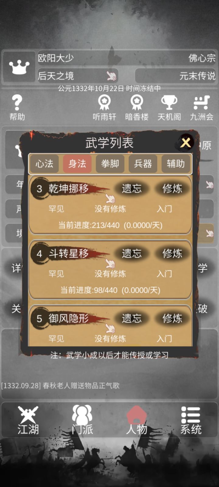 两年(主角12岁),基础内功圆满,并获得12个内功,若干身法、拳脚、兵器。我发现这游戏就是要和npc大宗师们拉关系,关系都出好了,总能获得不少好东西,武功也能请教上来。肝就行了。
