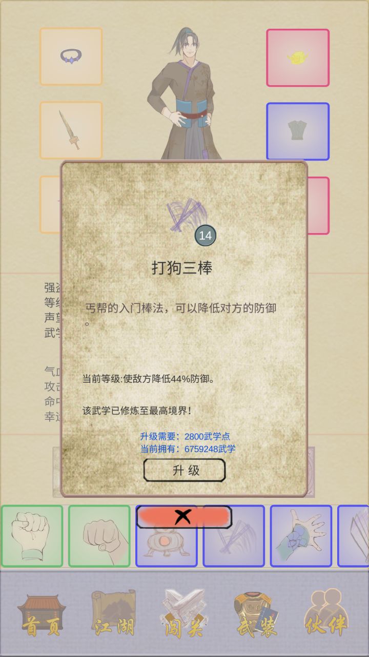 1.开局选皇族,完成新手任务后去大地图搜刮2.去空空武馆学洪拳,之后挑战野猪3.过了野猪直接扫荡10次,升级过7级加入六扇门(获取技能:千军万马)4.过一关,卡关就扫荡前一关100次,装备选好就全卖5.打到西域毒王那关时,多刷几次前一关,之后筹够50000去书院买逍遥游6.升满逍遥游,过了西域毒王就一直在这刷级,满级2007.没啥好说的了,就是最后一关看运气,3号不晕你就能赢8.是时
