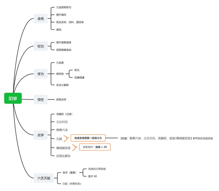 ★ 传送门整装待发:神:逆水之寒 气:麒麟臂 精:随意 悟性:30☆●○◎◇◆★□▲■△作为阴拳,我们基本上会在第二章前半段就成型。但是首先我们要知道成型需要的组件该如何获取,知道以后就可以开始拼拼图了。具体步骤先后可以按照个人喜好执行,这里就不过多赘述了。简单的做了个导图: 刷医术参考:刷悟性参考:获取轻功参考:☆●○◎◇◆★□▲■△1.先进入铁匠铺对话铁匠铺老板,选择{称手