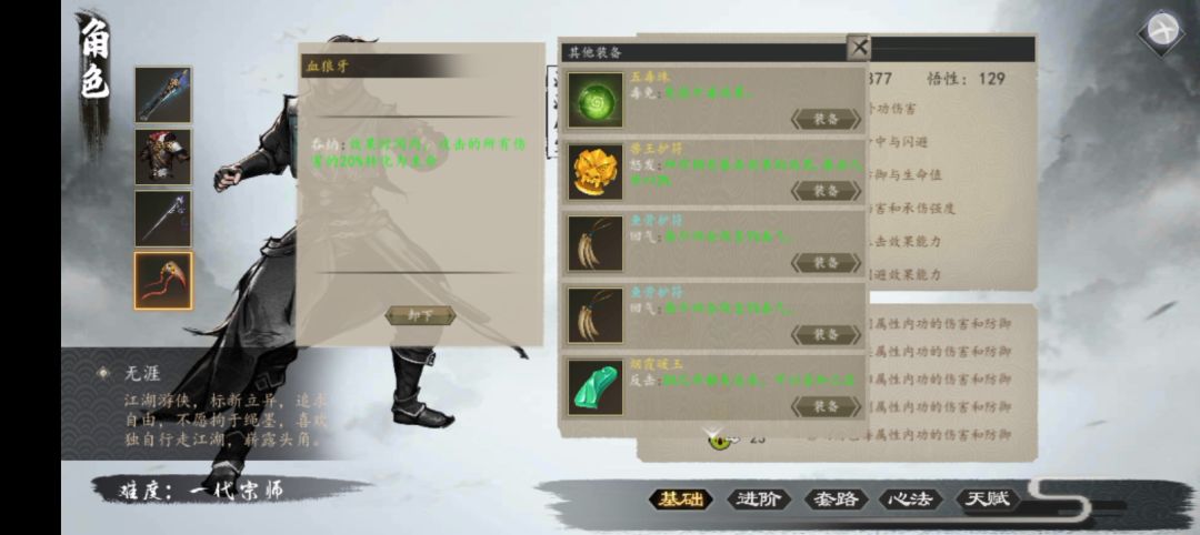 由于最近白云飞仙劲的武道效果消失了,暂时没玩了,就给大家更新一篇功略吧。首先感谢其他大佬提供的图,废话不多说,咱们先讲心法选择,由于适应属性的正派和邪线没有区别。九阴(直接搜有详细获得攻略,阴系功法第一)月饮刀(刀法80,悟性70在新手村的铁匠那看画即可领悟,比较好获得且招式强力)庄周北冥功(先去广成山的塔上找到七练拳后,学上,再到广成山顶上打独孤兄,打赢,把他招进来,再去荣城上方的小亭子那
