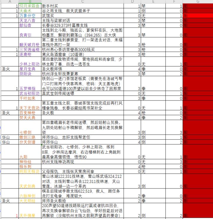 最左侧标1的是在做杭州主线支线之前可拿。标圣火、长春、华山分别为三派拜师才可以。空白的是得做主线往后走或者是醉拳、啸天棍法这种虽然直接可以拿但是拿了影响拿降龙。获取方式没写的是要么还没获取方式,要么我实在不知道哪里可以搞。工欲善其事必先利其器,出新手村后先把梯云宿空、七星步、一苇渡江拿了把轻功过500,然后把标1的全拿了然后一存档,之后安心各种换套路搞各种结局,怎一个爽字了得。😁