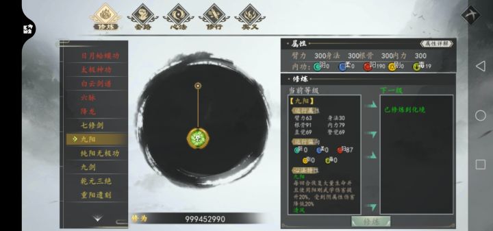 首先是天赋,十三太保意味着可以切换反弹打法,也意味着可以随意决定发展方向,其实用阳刚属性天赋更好;金刚体如果像我这样四维接近满的也不如用武器威力1.5,如果四维不满,那么我觉得更优,内力10%对攻防都有效,还有生命10%的优势;铁骨的免伤10%还是挺有意义的,因为我的组合最不缺伤害。再来看心法,九阳意味着大量免伤,尤其是四维高,免伤更惊人,此外百分比免伤越往后叠效果越差,因为是乘法而不是加法,所
