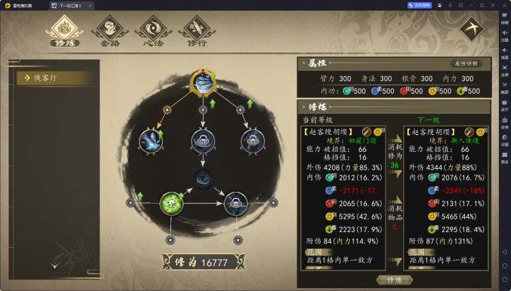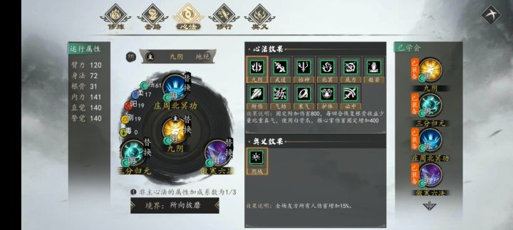 先说阴暗器玩法:阴暗器范围广,爆发高,无论是打单还是打群都有超高的伤害,可以完美触发天赋棋圣的暗器伤害增加20%和巧匠的连击。需要的心法有:《三分归元》、《九阴》、《庄周北冥功》、《傲寒六决》、《金阳玄典》(备用)、《镇域破玄劲》(备用)。需要的招式有:《小白飞刀》、《暗影秘典》、《子午透骨钉》这是成型之后的样子:成型之后打二周目自建门派一统江湖结局,正派、邪派只需要各三个回合就可以搞定。