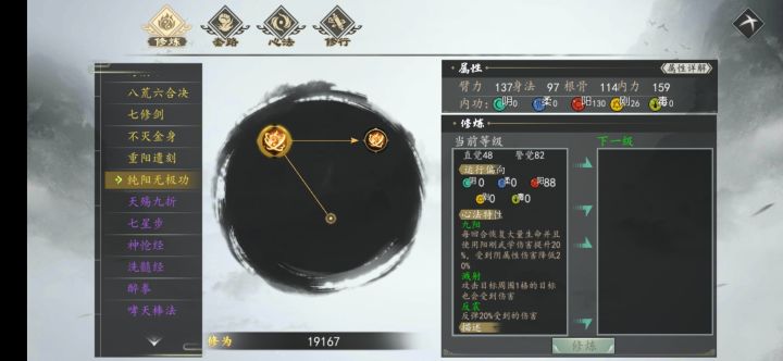 1.纯阳无极功做为最强阳心法竟然点满才加88,原谅我还沉迷在原来的141中咋了141点阳属性犯了版本号141的忌讳呀需要避讳2.红色秘籍里面放一个紫色心法,而且点满才53的阳,还有王法嘛不用嘛馋连斩武道,用嘛心塞3.自建门派可以的学的强力阳剑套路有点少,建议加一点华山功法流出呜呼哀哉!大阳已死,阴柔当道。