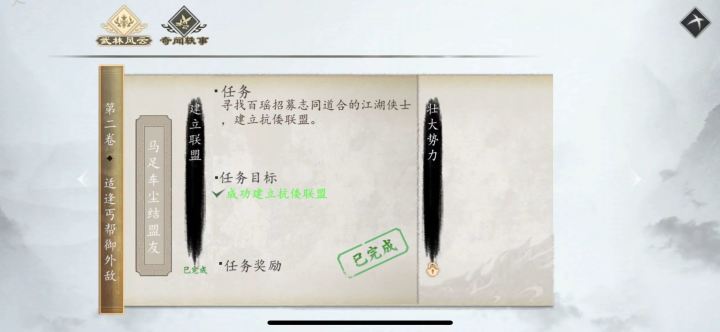 此BUG会导致无法完成主线任务!主线任务都无法推进,还玩个鸟啊。。先上图(iOS)抗倭路线,第二卷,马足车尘结盟友,壮大势力。问题出在壮大势力的“说服三大门派加入联盟”这一步。在这一步中,大世界里出现了本应该在下一步任务“与横戈成员对话”的npc,我对话了该npc以后他就消失了。这导致真正到了下一步任务时,无法找到此npc。从而使主线无法推进。