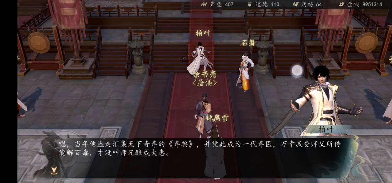 先前做了毒圣现身,然后做栢墨言加入任务就一直死循环这个对话了。按理说应该弹出和栢墨言的对话。